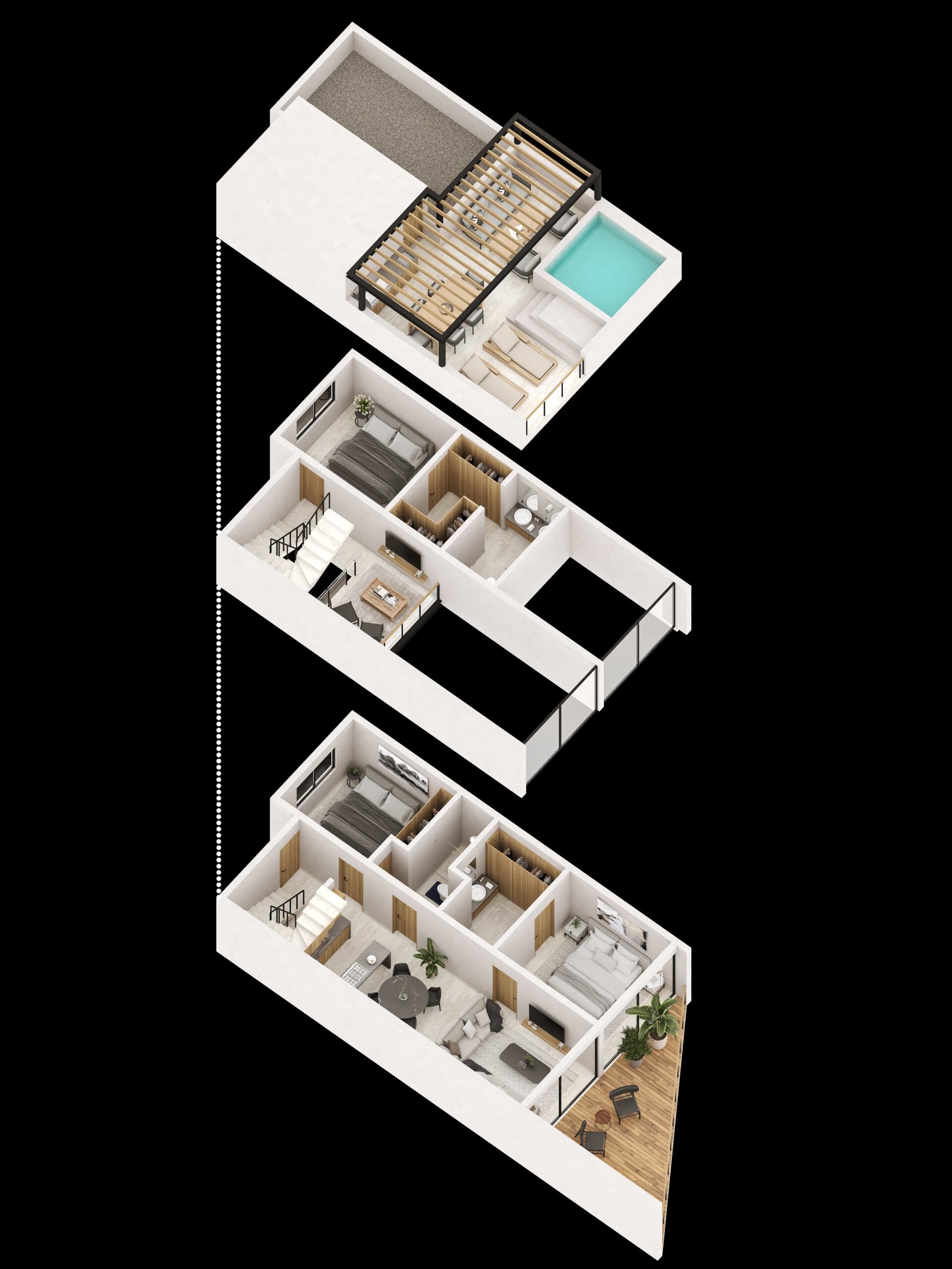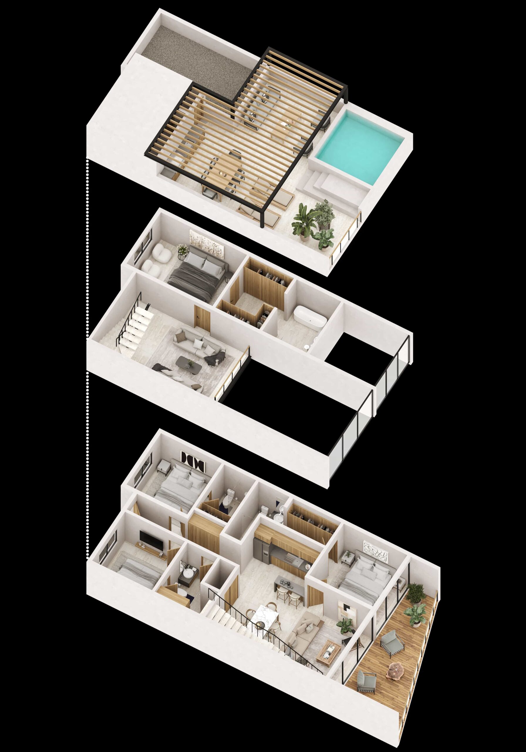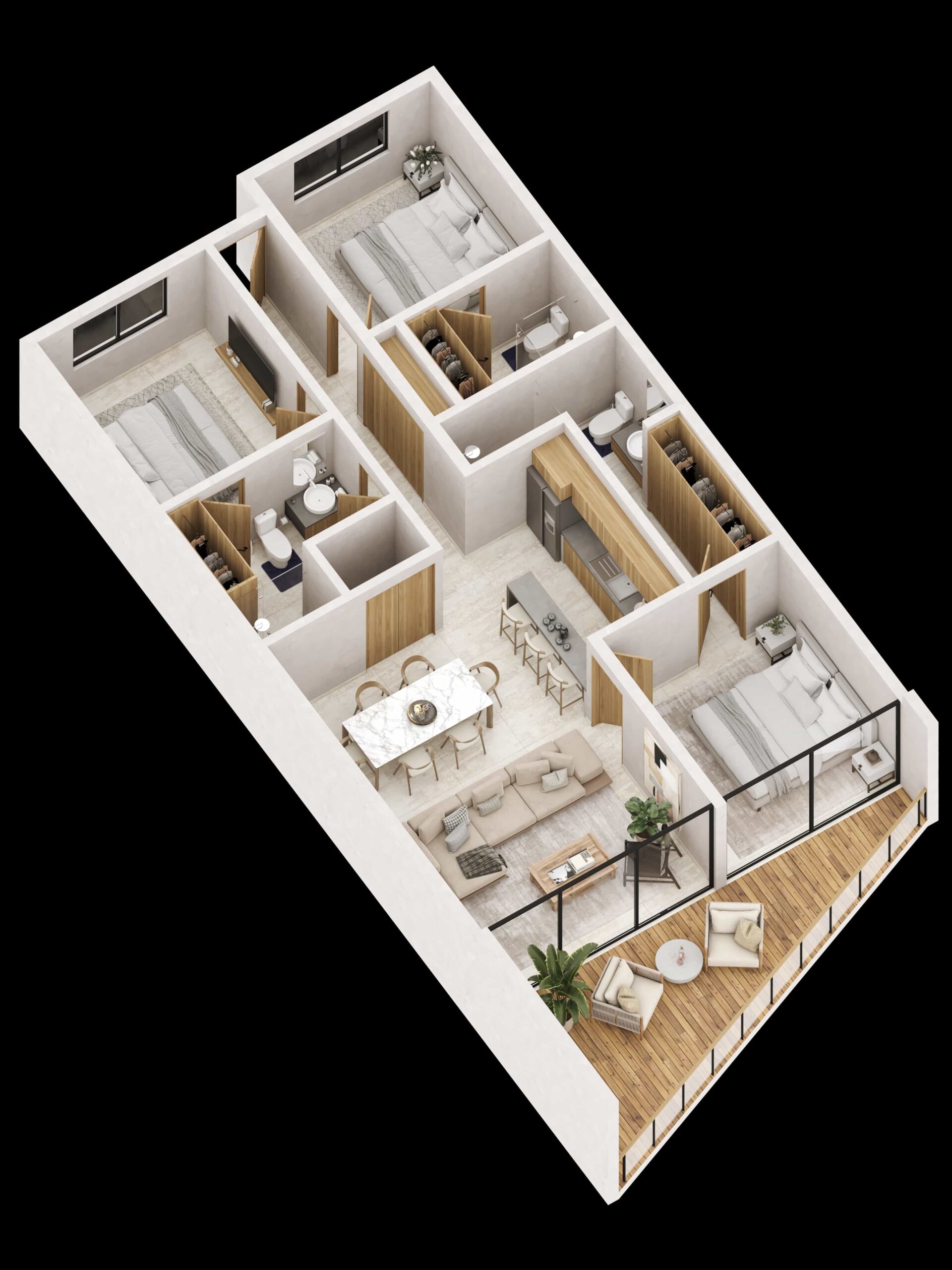 • Los departamentos de 1, 2, 3 y 4 recámaras, distribuidos en 2 torres de 24 niveles, ofrecen vistas panorámicas del paisaje natural y su entorno